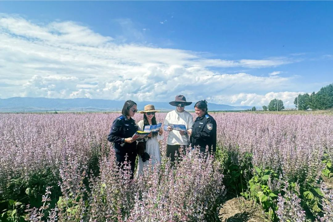 在紫苏花海入口,民辅警正拿着案例手册给游客们“上课”:“您看这起案子,游客扫码领‘花海纪念品’,结果银行卡被盗刷了……”