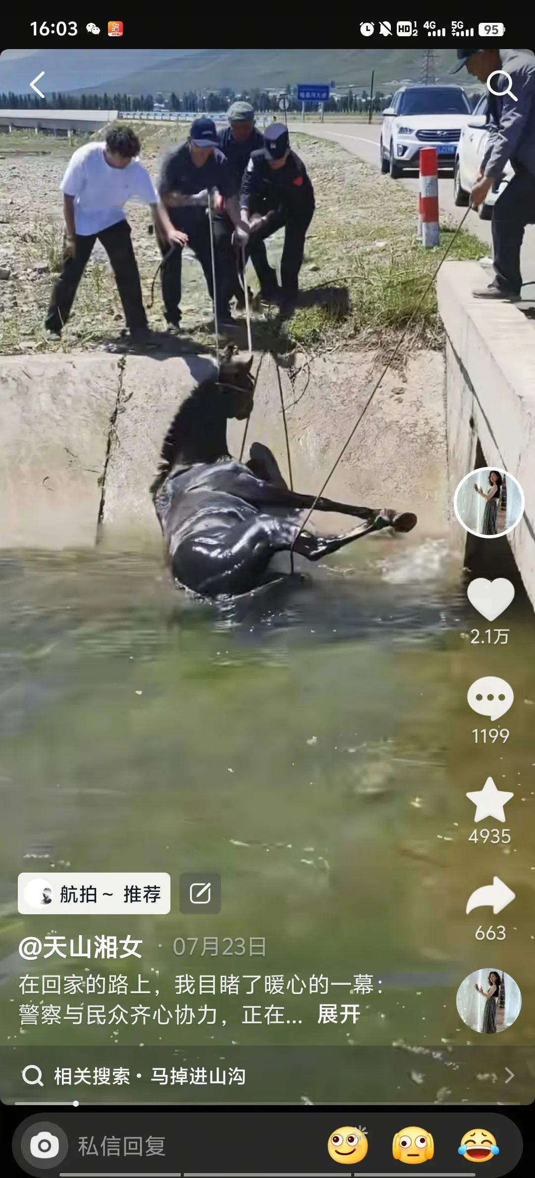 当日16时许,石女士驾车途经七十七团 4 连河渠道时,发现一匹马儿在渠道中不停挣扎,湍急的水流让它身形摇晃,情况十分危急。此时,周边已有几位群众闻讯赶来,正焦急地想办法救援,石女士见状,立刻用手机记录下现场情况,同时关注着救援进展。